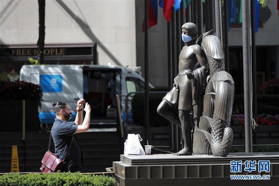 6月22日,在美國(guó)紐約洛克菲勒中心,一名男子拍攝“戴”口罩的雕像。美國(guó)約翰斯·霍普金斯大學(xué)22日發(fā)布的新冠疫情最新統(tǒng)計(jì)數(shù)據(jù)顯示,美國(guó)累計(jì)死亡病例超過12萬例。新華社記者王迎攝