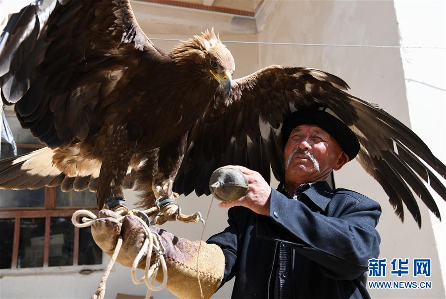 6月27日,庫(kù)爾馬西·胡特曼取下獵鷹的眼罩。馴鷹人平時(shí)會(huì)給獵鷹戴上眼罩,一般只有在獵鷹進(jìn)食、捕獵的時(shí)候才會(huì)取下。新華社記者宋彥樺攝