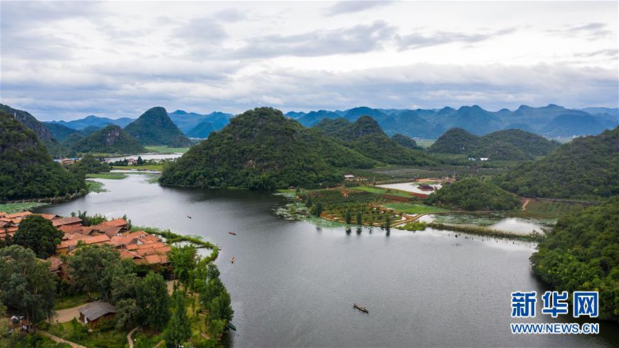 游人在普者黑國家濕地公園泛舟賞景(7月10日攝,無人機(jī)照片)。新華社記者胡超攝