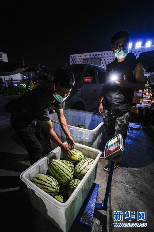 7月26日,在烏魯木齊新聯(lián)農(nóng)副產(chǎn)品綜合市場(chǎng)內(nèi),烏魯木齊市一小區(qū)志愿者(右)在幫助小區(qū)居民采購西瓜。新華社記者 趙戈 攝