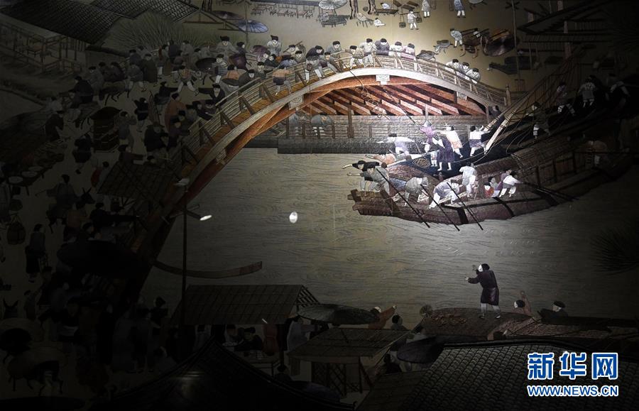 這是王素花和徒弟們新近繡制的《清明上河圖》局部(7月30日攝)。新華社記者李嘉南攝