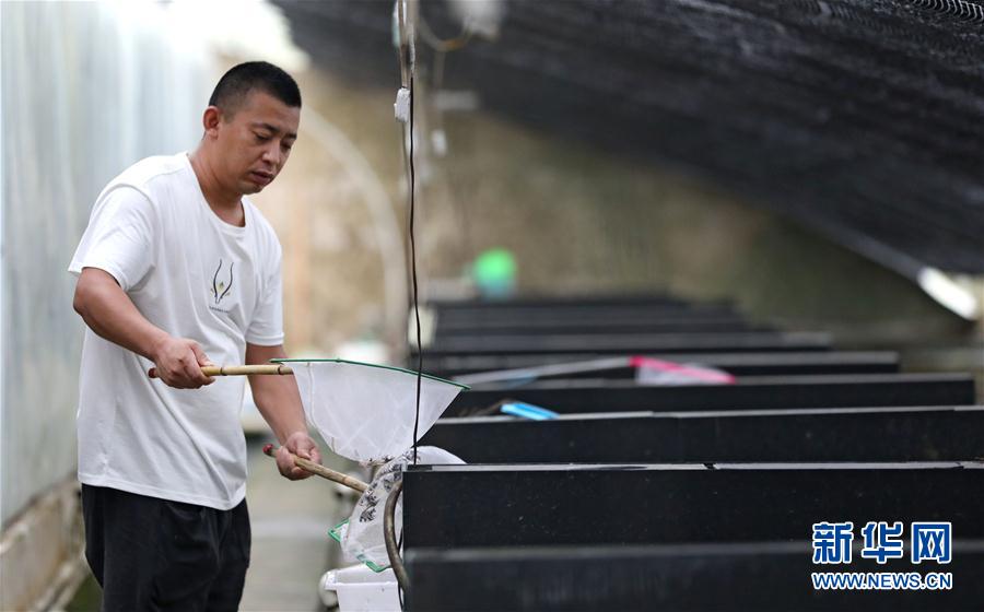 8月4日,張忠堡村村民李國(guó)鵬在自家觀賞魚養(yǎng)殖池里撈魚。新華社記者姚劍鋒攝