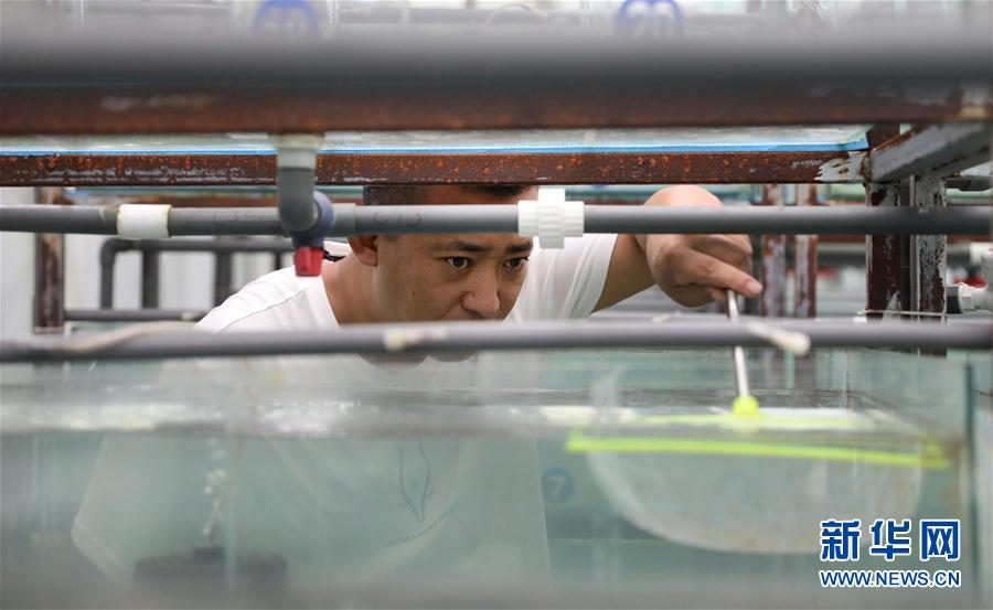 8月4日,張忠堡村村民李國鵬在觀賞魚養(yǎng)殖缸里分揀魚苗。新華社記者姚劍鋒攝