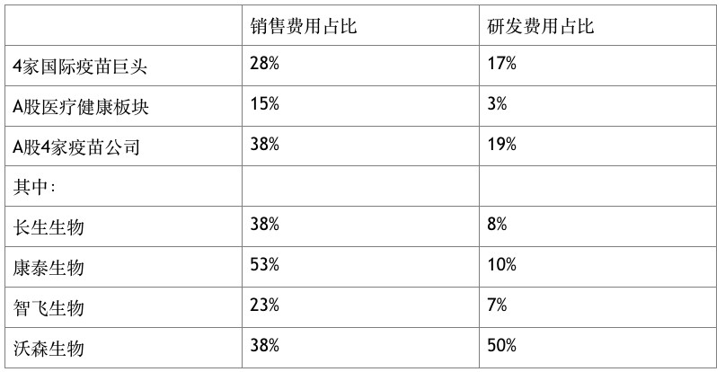從科研投入來(lái)看,其與國(guó)際巨頭亦存在巨大差距。以A股為例,目前上市有4家以疫苗為主業(yè)的企業(yè)。Wind數(shù)據(jù)顯示,2017年4家疫苗公司總銷(xiāo)售費(fèi)用達(dá)18億元,占營(yíng)業(yè)收入38%;4家國(guó)際疫苗巨頭(輝瑞、默沙東、賽諾菲、GSK)總銷(xiāo)售費(fèi)用占比28%。反觀研發(fā)費(fèi)用,A股醫(yī)療保健板塊總研發(fā)費(fèi)用319億元,占總營(yíng)業(yè)收入的2.8%;4家疫苗公司除沃森生物外,研發(fā)費(fèi)用占比均未超過(guò)10%;4家國(guó)際疫苗巨頭總研發(fā)費(fèi)用占比17%。