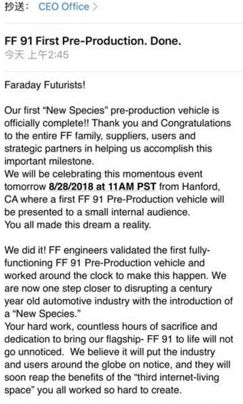 智通財(cái)經(jīng)APP獲悉,當(dāng)?shù)貢r(shí)間27日凌晨,賈躍亭創(chuàng)辦的美國(guó)電動(dòng)汽車(chē)品牌FF(Faraday Future)的員工收到來(lái)自CEO辦公室郵件,稱(chēng)FF91的第一輛試產(chǎn)車(chē)已經(jīng)完成。