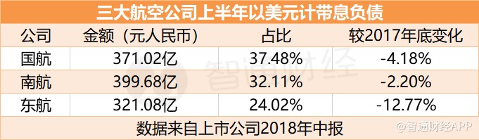 智通財經(jīng)APP了解到,2015年高峰時,三大航空公司美元負(fù)債水平普遍在80%左右。2018年中期財報顯示,截止2018年6月30日,國航以美元計的帶息負(fù)債占帶息負(fù)債總額比重已經(jīng)降至37.48%,南航、東航的美元帶息負(fù)債占比也分別降至32.11%、24.02%。絕對金額方面,目前以人民幣計美元有息負(fù)債規(guī)模,國航為371.02億、南航399.68億、東航321.08億。