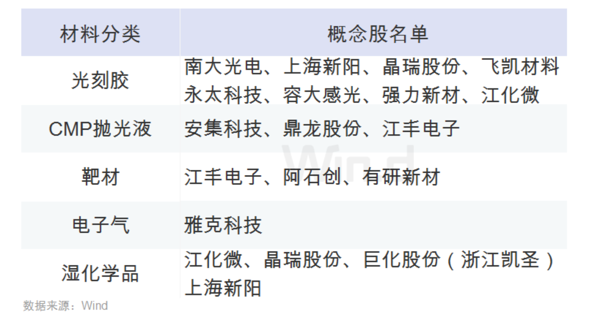 關(guān)注光刻膠:光刻是整個集成電路制造過程中耗時最長、難度最大的工藝,耗時占IC制造50%左右,成本約占IC生產(chǎn)成本的1/3。從需求端來看,光刻膠可分為半導(dǎo)體光刻膠、面板光刻膠和PCB光刻膠。其中,半導(dǎo)體光刻膠的技術(shù)壁壘最高。目前全球光刻膠市場基本被日本和美國企業(yè)所壟斷。國內(nèi)生產(chǎn)的光刻膠中,PCB光刻膠占比94%,LCD光刻膠和半導(dǎo)體光刻膠占比分別僅有3%和2%。國內(nèi)PCB光刻膠國產(chǎn)替代進(jìn)度快,面板光刻膠和半導(dǎo)體光刻膠與國外相比仍有較大差距。
