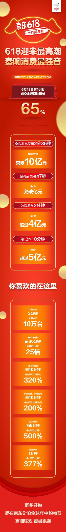 深圳新聞網(wǎng)2019年6月18日訊 6月18日零點的鐘聲猶如一聲清脆的發(fā)令槍,京東618十六周年慶迎來了18天中的下單最高潮,中國億萬消費市場的旺盛活力在這一刻盡情綻放,第一個小時的成交金額同比增長65%,京東在618這場席卷全民消費熱潮中的核心地位進一步凸顯。