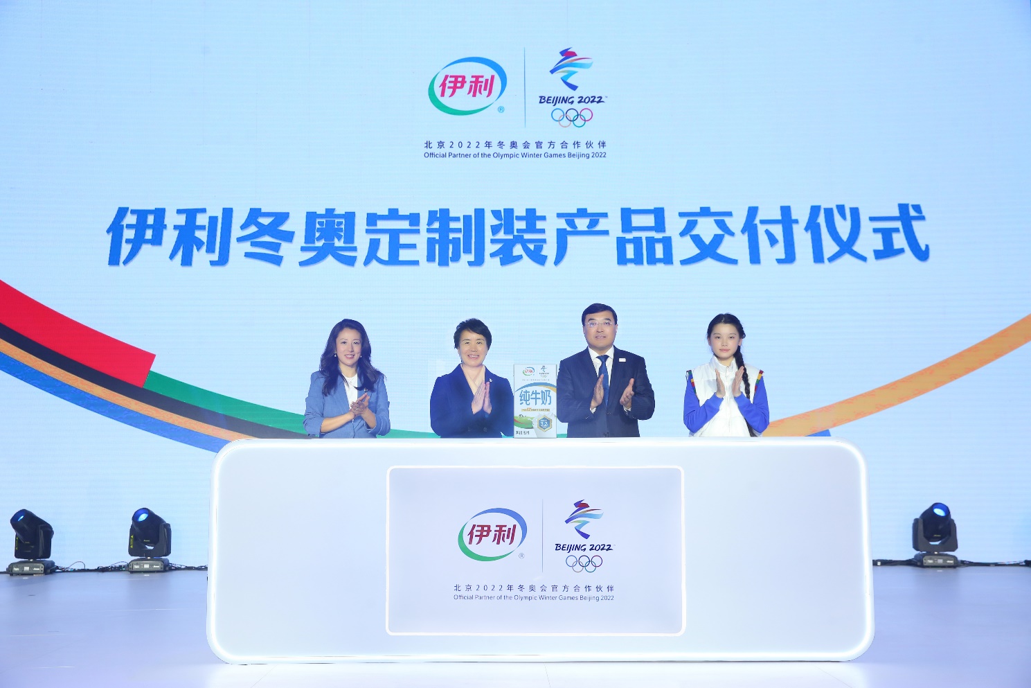 北京冬奧組委專職副主席、秘書(shū)長(zhǎng)韓子榮(左二),伊利集團(tuán)董事長(zhǎng)、總裁潘剛(右二),北京冬奧組委運(yùn)動(dòng)員委員會(huì)主席楊揚(yáng)(左一),伊利冬奧志愿團(tuán)形象大使(右一)共同啟動(dòng)伊利冬奧定制裝產(chǎn)品交付儀式