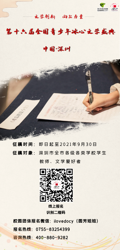 讀特客戶端·深圳新聞網(wǎng)2021年7月12日訊 為繼承和發(fā)揚(yáng)中華文化及冰心文學(xué)精神,促進(jìn)中華文化、中國現(xiàn)代化文學(xué)史更深入地植入深圳下一代青少年心中,2021年“第十六屆全國青少年冰心文學(xué)盛典中國·深圳”正在愛好文學(xué)的師生學(xué)友們之間熱烈展開。