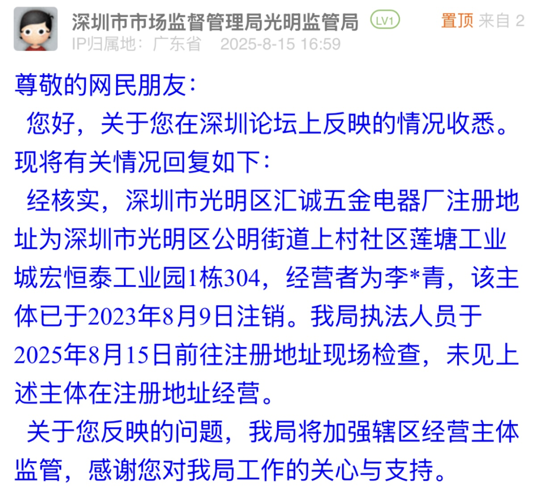優(yōu)化建議:深圳市市場(chǎng)監(jiān)督管理局光明管理局的回應(yīng)中,核實(shí)了涉事電器廠已注銷,且不在注冊(cè)地經(jīng)營(yíng),也提及加強(qiáng)轄區(qū)主體監(jiān)管,但市民反映的排插套用注銷主體信息銷售、違規(guī)標(biāo)識(shí)3C標(biāo)志等關(guān)鍵問(wèn)題,未得到明確解答。若回應(yīng)中能豐富指引類內(nèi)容,如告知市民可向平臺(tái)追責(zé)的途徑、提交證據(jù)的具體方式,為市民維權(quán)提供清晰方向,將更貼合市民需求,也能讓回應(yīng)更具實(shí)際意義。