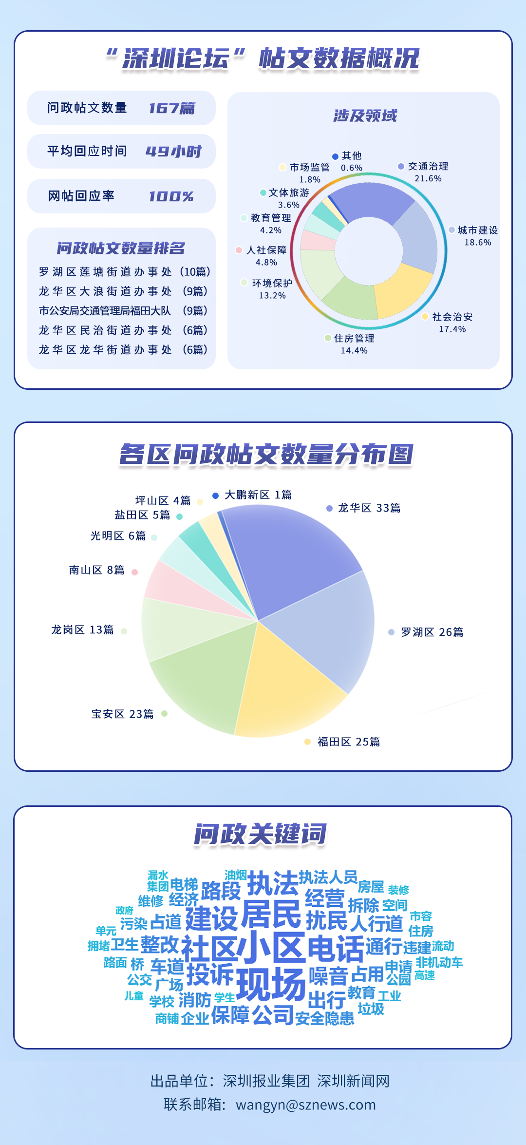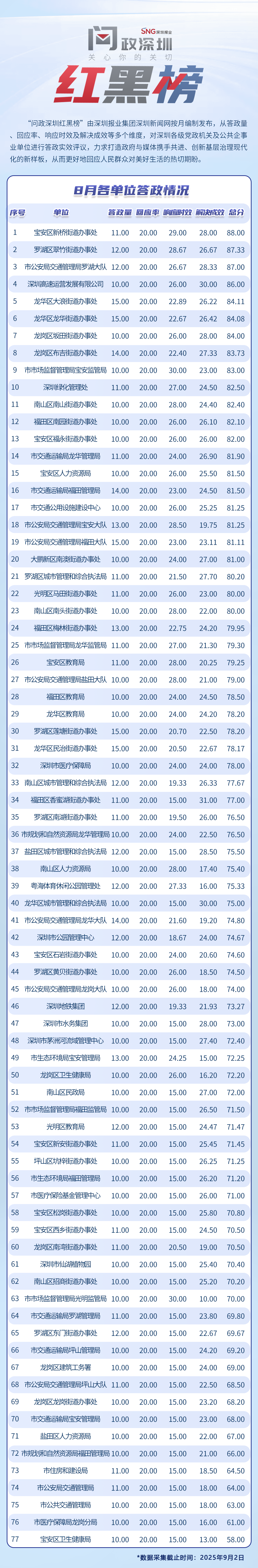 為探尋媒體如何精準(zhǔn)賦能基層治理現(xiàn)代化的“深圳路徑”,深圳報(bào)業(yè)集團(tuán)正式掛牌成立“問(wèn)政深圳”工作室,旨在進(jìn)一步推動(dòng)網(wǎng)絡(luò)問(wèn)政工作的高效開(kāi)展。為確保相關(guān)工作更加契合實(shí)際需求,自上期起,深圳報(bào)業(yè)集團(tuán)深圳新聞網(wǎng)按照“最快速度辦結(jié)”的總體要求,將原有月度榜單創(chuàng)新升級(jí)為“問(wèn)政深圳紅黑榜”,并對(duì)評(píng)分體系進(jìn)行了細(xì)致優(yōu)化。該榜單從答政量、回應(yīng)率、響應(yīng)時(shí)效及解決成效等多個(gè)維度,對(duì)深圳各級(jí)黨政機(jī)關(guān)及公共企事業(yè)單位進(jìn)行答政實(shí)效評(píng)議,力求打造政府與媒體攜手共進(jìn)、創(chuàng)新基層治理現(xiàn)代化的新樣板,從而更好地回應(yīng)人民群眾對(duì)美好生活的熱切期盼。