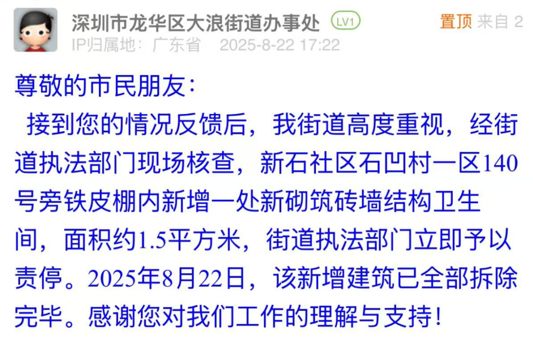 案例點(diǎn)評(píng):8月21日晚間,市民發(fā)布帖文反映違建問(wèn)題,大浪街道以“雷霆處置”展現(xiàn)安全至上的治理?yè)?dān)當(dāng)。接到投訴后,街道迅速核查,在22日給出回應(yīng),表示已完成拆除工作,做到了“速辦速結(jié),質(zhì)效雙優(yōu)”。此次響應(yīng)既體現(xiàn)“隱患即事故”的底線思維,更以“發(fā)現(xiàn)即拆除”的高效行動(dòng),彰顯基層治理對(duì)民生安全的敏銳感知與果斷處置能力,切實(shí)筑牢居民“身邊安全”防線。